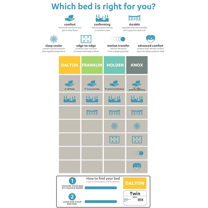 Made with classic pillow top styling, our Holden mattress offers an added layer of foam in the top of the bed to cradle your body in total comfort. The Verti-Coil innerspring system will give your body the support you want so that you can get the rest you need, providing amazing comfort and support for all of your pressure points. Want to sleep cooler at night? This open coil spring system supports good airflow so you can do just that keep you cool and comfortable all night long. Plus, the coils isolate movement so you’ll stay sound asleep even if there�s other movement. Made in the USA.