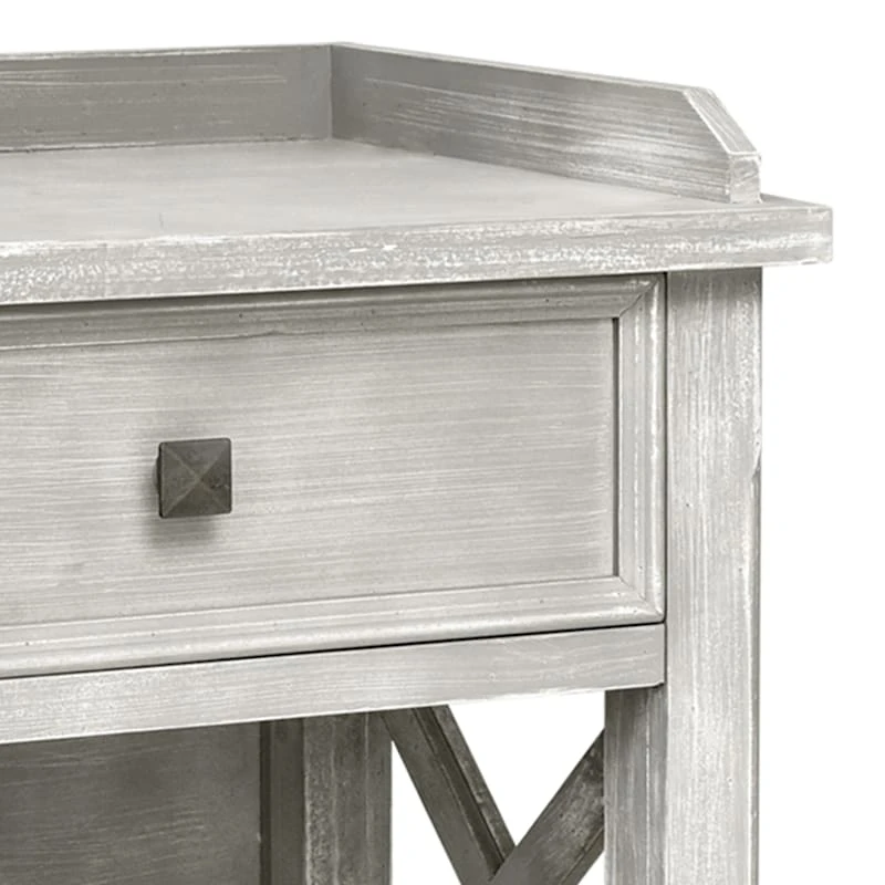 Our Jane X-side table has two USB ports for easy connectivity. This small whitewashed end table is also the ideal spot for your morning coffee or the TV remote. Crafted from wood and manufactured wood, this decorative side table features a whitewashed finish for vintage appeal. This two-drawer table has a small drawer up top and another on the bottom with an open center shelf for books and magazines or little treasures you want to display.
